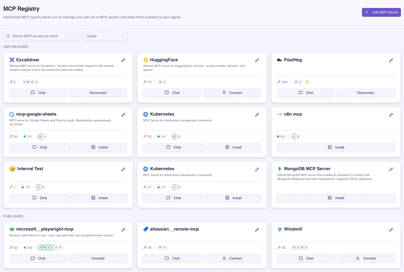 - Private MCP Registry: the catalog where teams define which MCP servers can be installed, how they are configured, and which credentials they require.