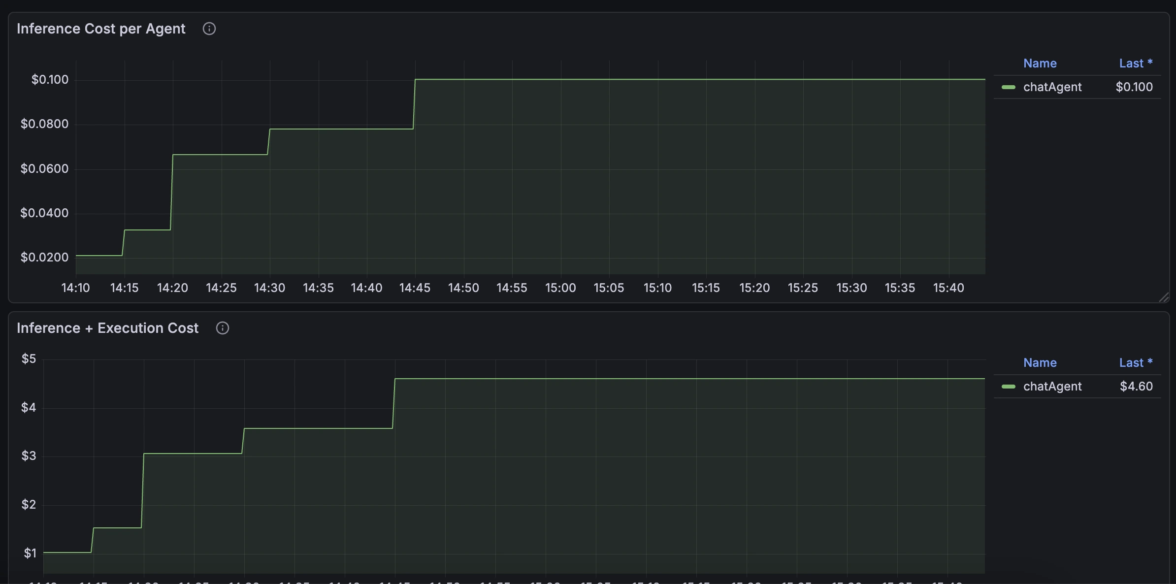 This is also useful for attributing costs. Archestra already exports llm_cost_total, which tracks LLM inference spending per agent. Combined with agent_executions_total, you can calculate the full operating cost of each agent (inference + per-execution fees). The built-in GenAI Observability dashboard includes this in the main Cost section, with execution-level totals grouped separately under External Agent Executions. See Observability for setup.