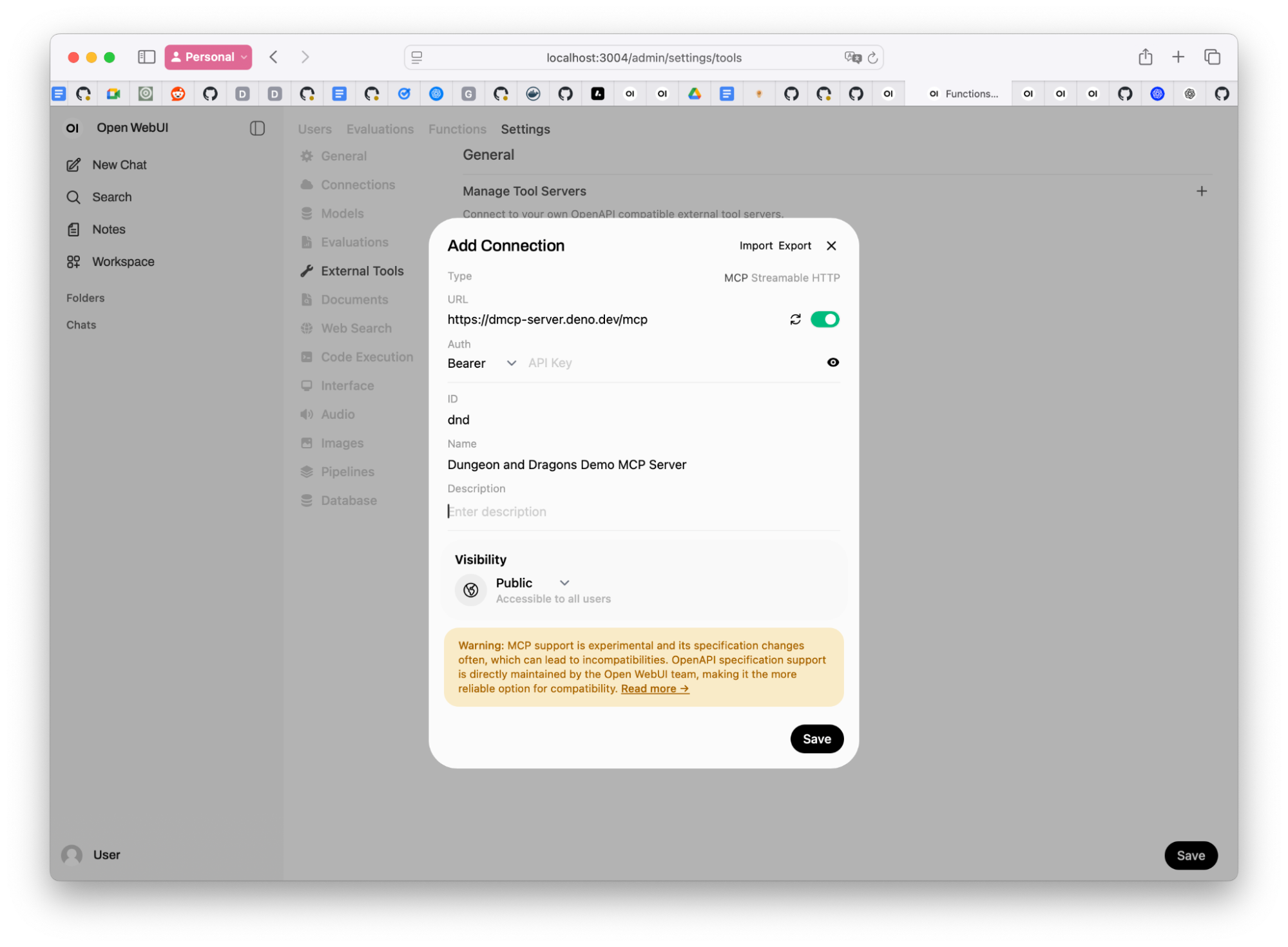 Navigate to Settings > External tools > Manage Tool Servers > +