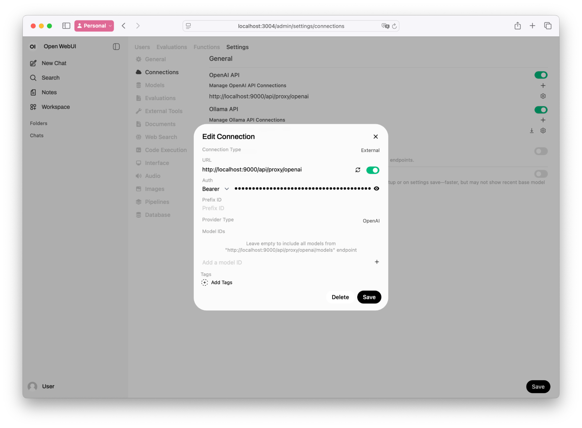 Navigate to Settings > Connections > OpenAI > Configure (look for the wrench icon).