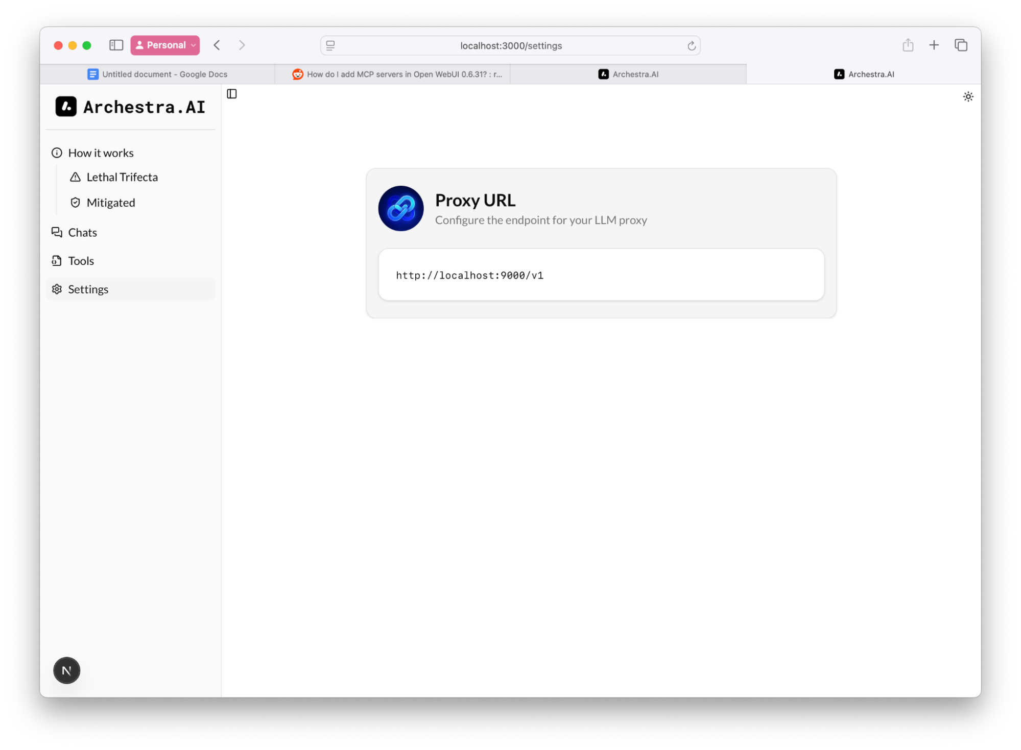 ☝️If you're not sure where is Archestra BASE_URL you can navigate to Archestra settings, in our example it on http://localhost:3000✌️️If you're running OpenWebUI in its own Docker container locally, separately from the platform, the