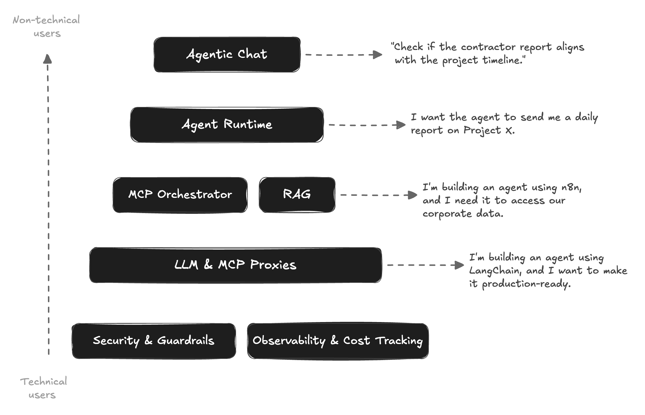 LLM & MCP Proxies — Drop-in proxy between your apps and LLM providers. MCP Gateway provides a single endpoint for all MCP tools. Works with any framework: n8n, LangChain, Vercel AI, Pydantic AI, Mastra.